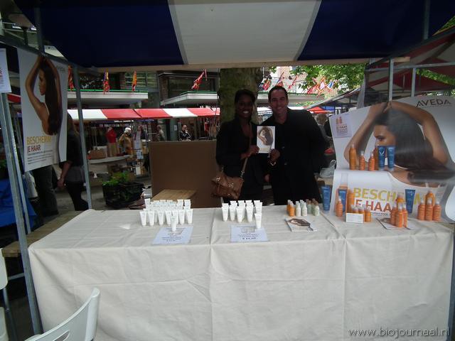 Xiomara en Frank legden bezoekers de werking van de verzorgingsproducten van Aveda uit.
