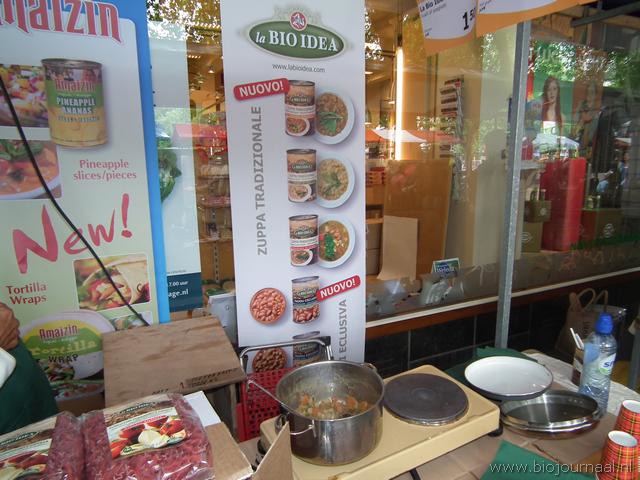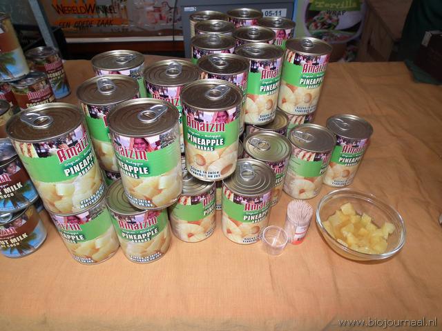 Anke laat bezoekers proeven van de ananas van Amaizin en de nieuwe soepen van La Bio Idea.