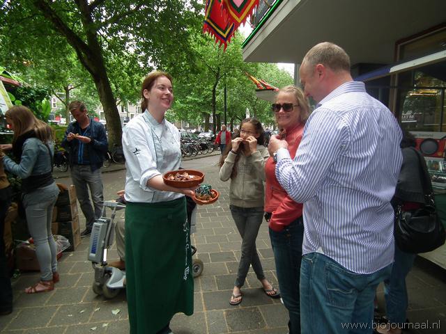 Maaike Nolters liet bezoekers proeven van biologisch vlees, hier heeft ze frikandellen en spareribs vast.