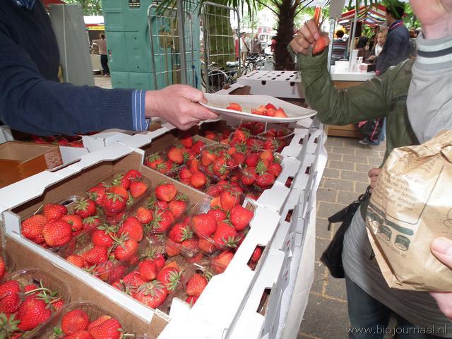 Bezoekers proeven maar al te graag van de biologische aardbeien van Kroon.