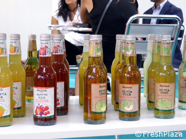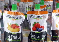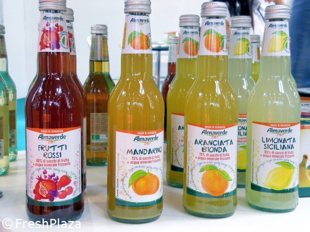 De nieuwe Almaverde bio-dranken. Verkrijgbaar in de smaken sinaasappel, citroen, mandarijn en rood fruit.