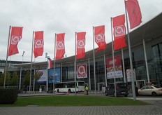 De beursvlaggen van Anuga wapperen in de wind voor het beursgebouw