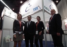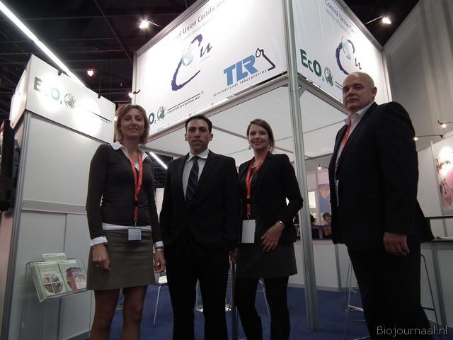 EcO2, Control Union Certifications en TLR international laboratories stond samen in één stand. Van links naar rechts: Eveline van Tuijl (TLR), Udi Gabay (Control Union), Linda Groeneweg (EcO2) en Harm Janssens.