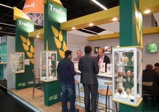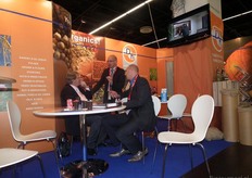 Walter Doens (midden) en Lijnard Peeman (rechts) van Doens Food Ingredients bv in hun stand in gesprek met een klant.
