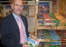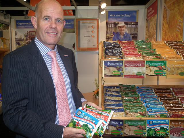 Gerrie Groot van G. Kramer en Zonen bv laat de biologische zuurkolen zien in de - nu nog - oude verpakking. De restyling, zoals die nu al in het schap te zien is bij de gangbaar geproduceerde zuurkool, wordt binnenkort ook doorgevoerd voor de biologische zuurkool.