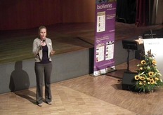Heleen Klinkert van Bionext kondigt de derde workshop in de Aula aan.