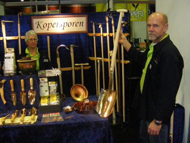 Joop toont de spade met koperen blad, welke gebruikt is voor de Ekoland Innovatieprijs.