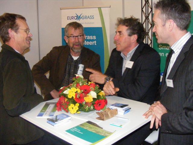 Bernard Bles en Jos Deckers van EuroGrass in gesprek met twee BioVak-bezoekers.