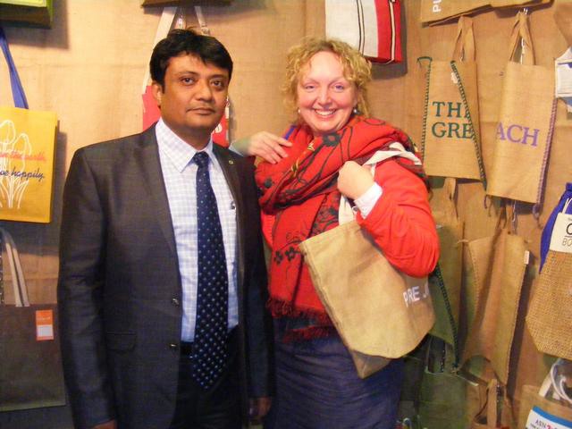 Désirée Rasenberg met haar Indiase zakenpartner Mr. Pinaki Bhowmick in de stand van Pure Jute. De officiële BioVak-tas werd geleverd door Pure Jute.