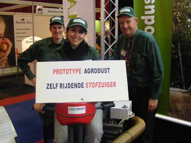Het team van Agrodust showt hun zelfrijdende stofzuiger. Vlnr Jan Struik, Ximena Bekx en Jan Schuringa.