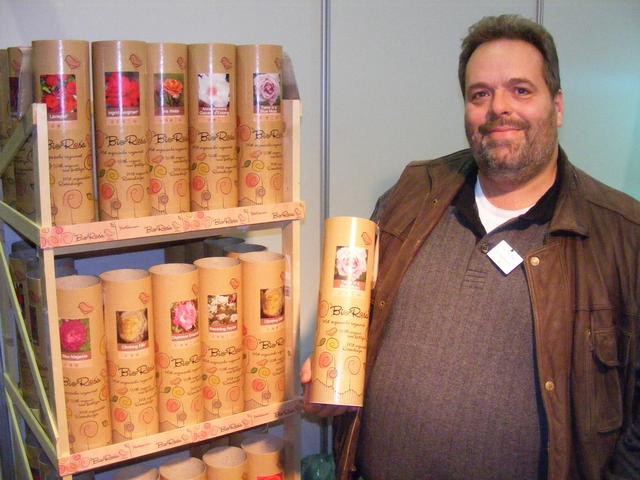 Hans van Hage van biologische rozenkwekerij de Bierkreek met zijn handige verpakkingen.