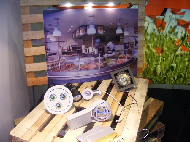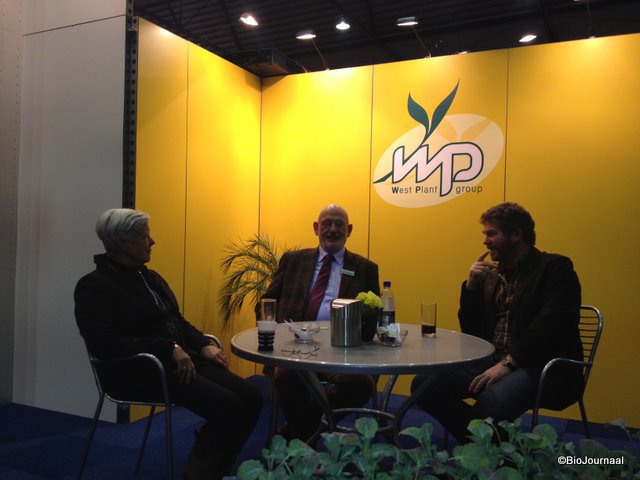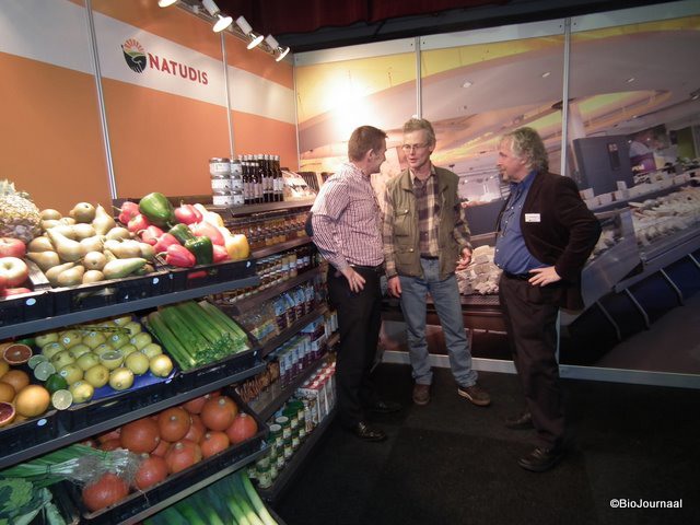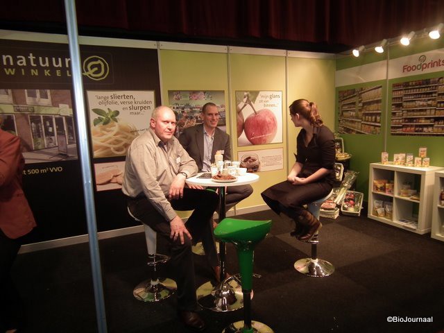 In de stand van Wessanen Benelux werden de diverse bedrijfsonderdelen apart uitgelicht. Hier zijn Ricus Janssen, Rudi Gerding (De Groene Winkel Zeist) en Paul Verweij in gesprek. Op de achtergrond een foto van één van de GooodyFooods-winkels.