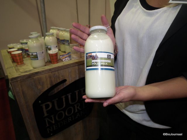 Pleunie toont melk van de Harmanna Hoeve, de boiologisch-dynamische melkveehouderij van Anne en Anneke Koekkoek.