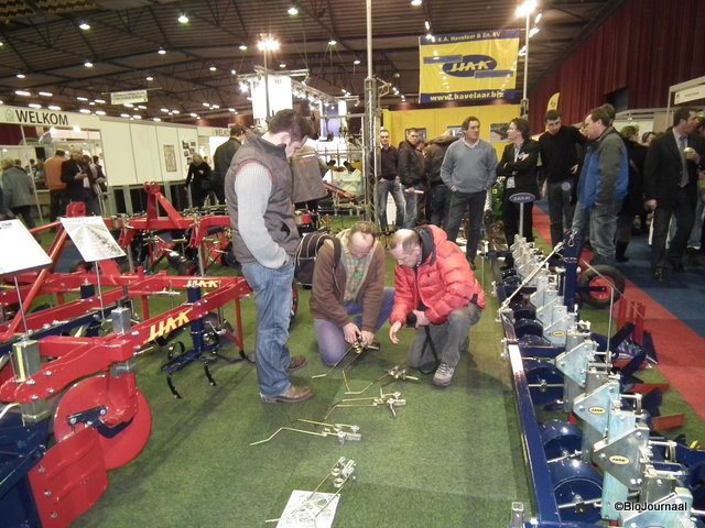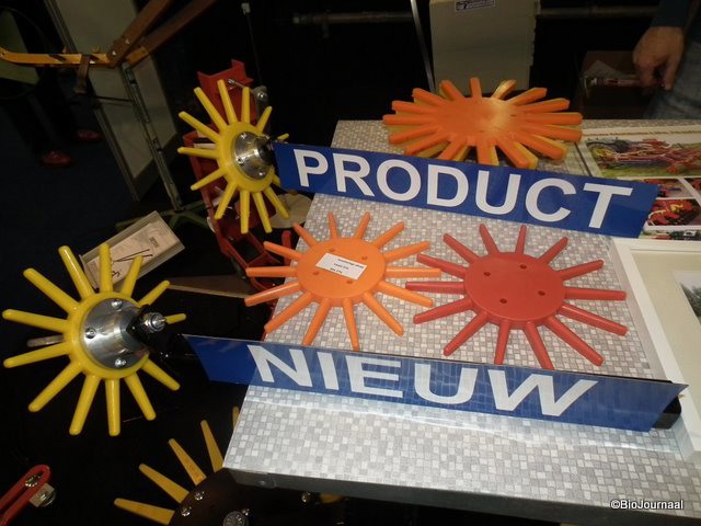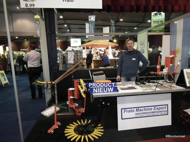 "Theo Remij in de stand van Frato. Hij geeft aan dat de machines meer en meer aangepast worden aan de wensen van de gebruikers. "In de praktijk ervaren zij wat er beter kan." De machine rechts is bijvoorbeeld voorzien van nieuwe metalen vingers."