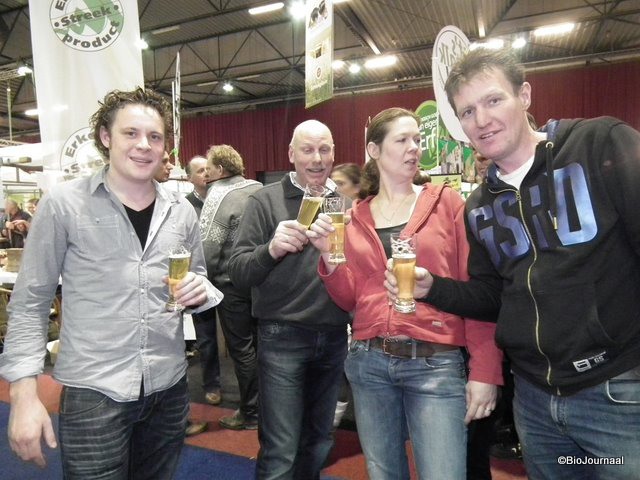 Guido Frijns, Willem Ruijpers en Felix Huntjens drinken samen een biologisch biertje van Gulpener in de stand van BD-Totaal.