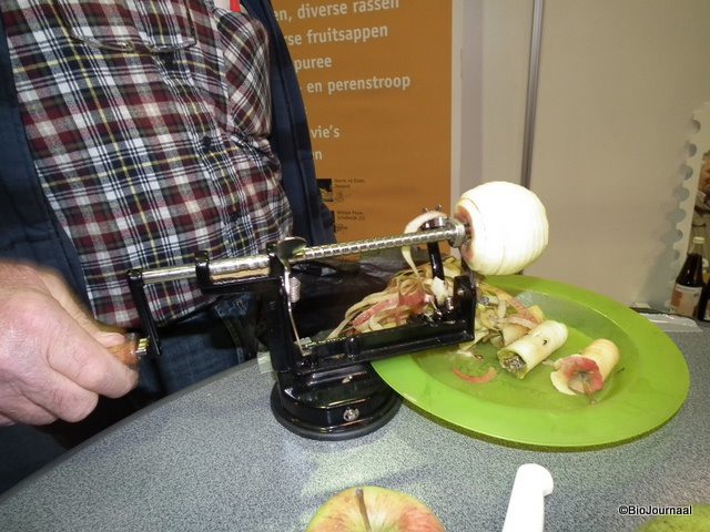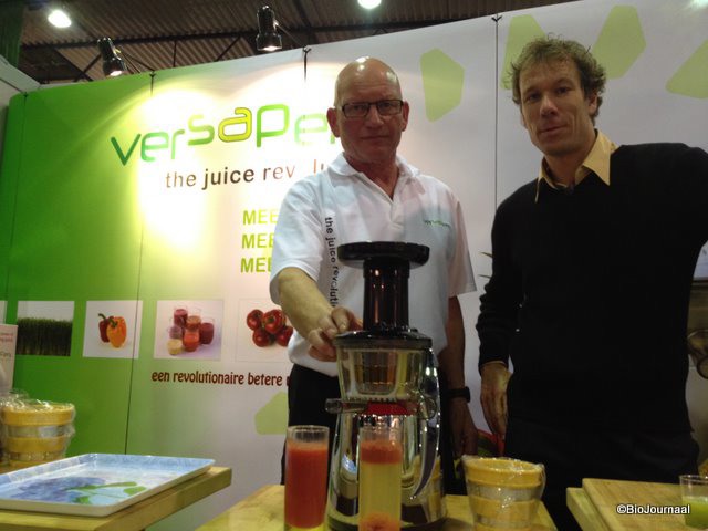 Gerrit van Cotthem en Joost Duisterwinkel van Versapers bieden versgeperste fruitdrank aan. De slowjuicers perst alle sap uit het fruit.