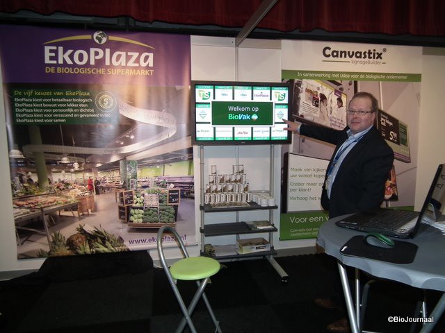 "Nico Oostrum toont de mogelijkheden in beeldschermcommunicatie van Canvastix. "We hebben al diverse EkoPlaza's behangen met onze schermen."