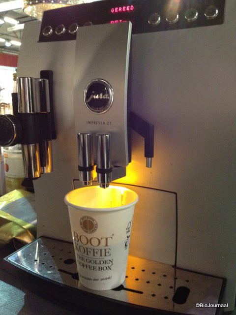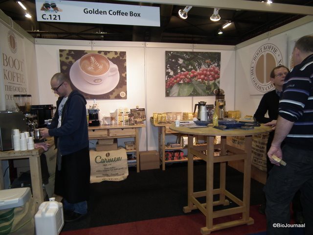 Shiva Niet is druk met het bereiden van koffie in de stand van de Golden Coffee Box. Rechts is Barend Boot in gesprek.
