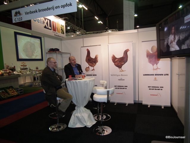 "Rob Boomstra (rechts) in gesprek met Ignace Deroo'(Boerenbond - België). De nieuwste kip van Verbeek broederij en opfok: NOVOgen Brown (midden). "Deze is vanaf oktober leverbaar", vertelt Rob."