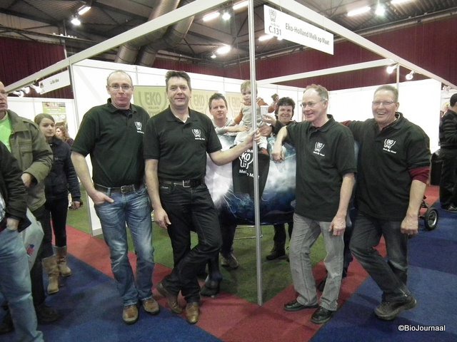 Eko-Holland viert dit jaar haar tienjarig bestaan. Jos Elderink, René Cruijsen, Pieter Boons en Henk Hoefnagel poseren bij de koe. Achter en bovenop de koe: Koos en Monique van der Laan met Ilse (De Beekhoeve).