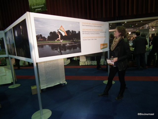 Frederiek Bosch bij de eerste foto van haar foto-expositie, waarin de vitaliteit van BD-landbouw getoond wordt.