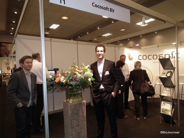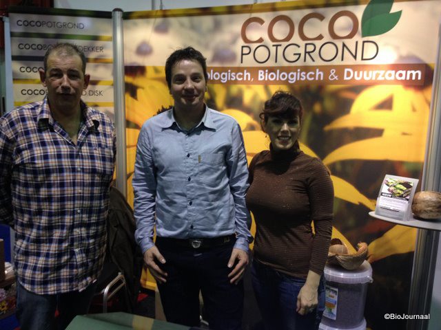 Gijs Lamers van Coco Potgrond (links) en Niels Kraaipoel van Ecocycle (midden) deelden hun stand op de beurs.
