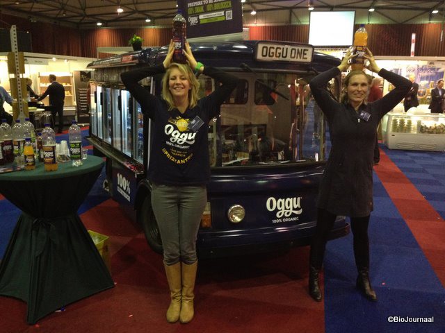 Claire van Andel en Susanne de Raaij met een ludieke presentatie van hun biologische frisdrank. De Oggu One - een omgebouwde Engelse melkauto - was een opvallende verschijning op de beurs.