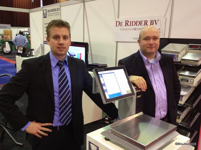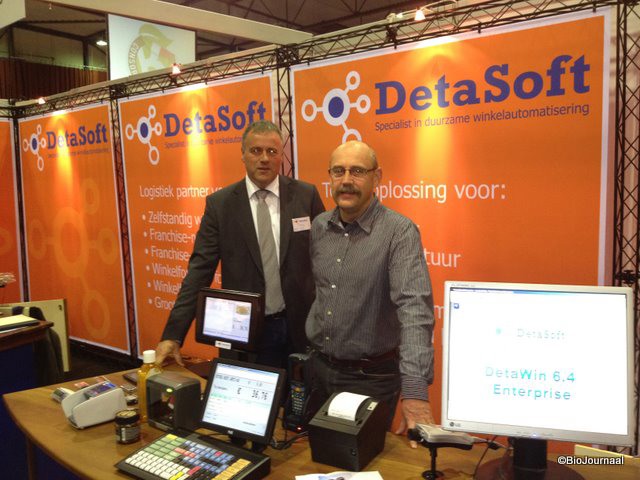 Detasoft automatiseerders Jan Velten (links) en Henk Hogendoorn staan met hun kassasystemen op de beurs.