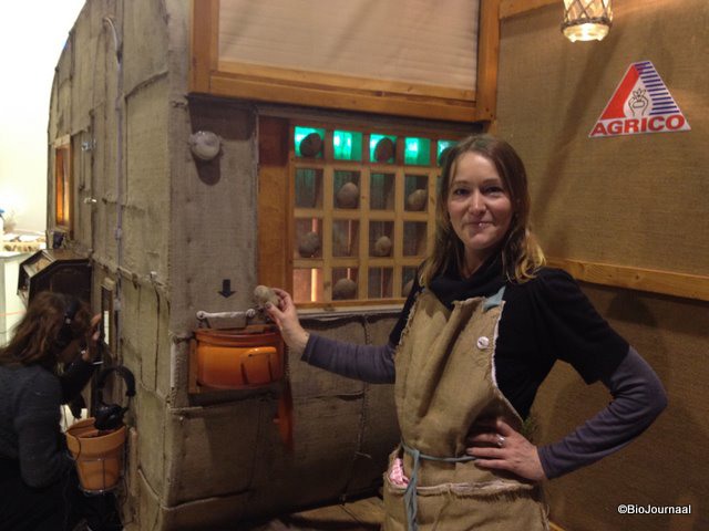 Selina Houwing laat bezoekers in de Knol d' Amour de leifde voor de aardappel ervaren. In de caravan (die in de Agriko-stand stond) zit collega Martijn Jansen.