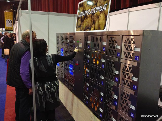 De Patatomat (aardappelautomaat) van het Vlaamse WDM wordt gedemonstreerd aan een bezoeker. De verlichte vakken laten zien dat het product aanwezig is. In de vakken kunnen aardappelzakken van 10 kg.