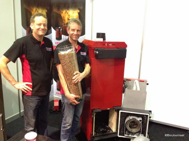 Peter Gorter van Pietre e Calore (links) en Ton ten Have van Novus met de korrels die als brandstof dienen voor de kachels van Pietre e Calore.