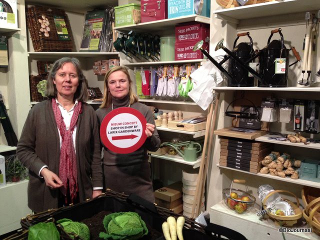 Annetje de Jong (links) en Imke van Deventer van Larix Gardenware staan op de beurs met hun nieuwe shop-in-shop concept.