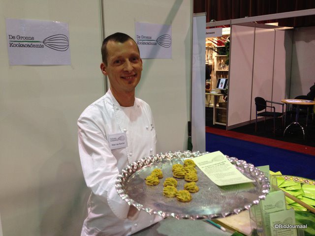 Peter van Berckel van De Groene Kookacademie biedt zijn bezoekers een van zijn culinaire creaties aan.