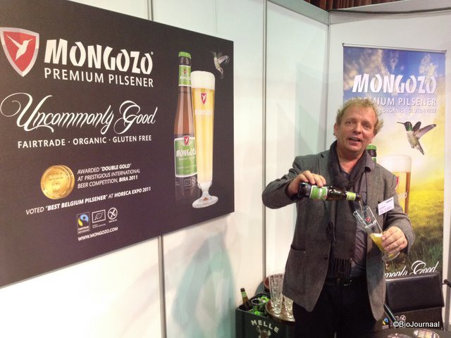 Jan Fleurkens schenkt een lekker Mongozo premium pilsener in. In de bar van Biojournaal was veel vraag naar dit smakelijke biologische bier.