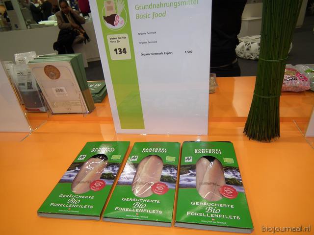 Veel visproducten op het noviteitenplatform. Dit zijn forelfilets uit Denemarken (Organic Denmark Export).