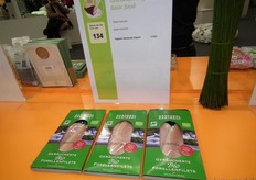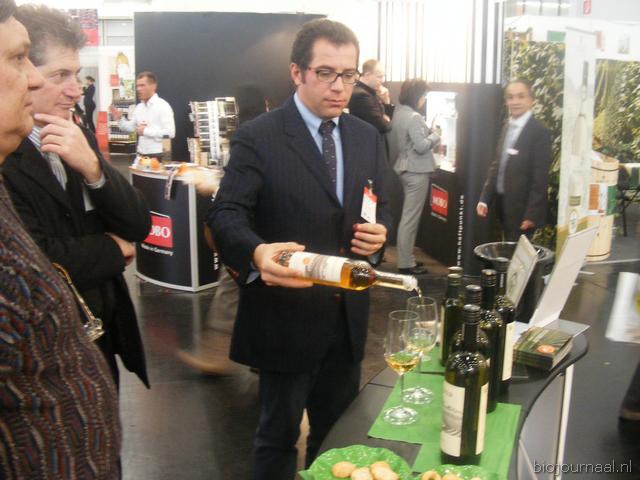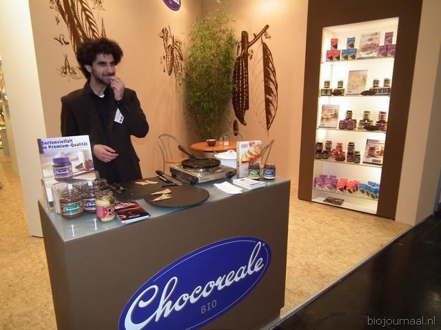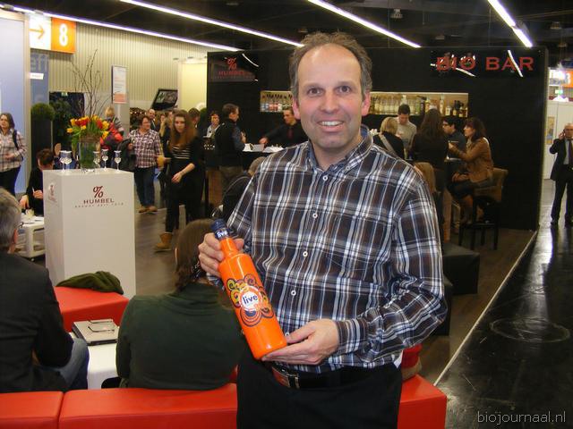 Greenchef Olivier van der Staal met een Bio-aperative uit de Bio Bar. Een fles met deze kleur mag natuurlijk niet ontbreken in een Nederlandse fotoreportage. Olivier weet als biokok van het eerste uur alles over nieuwtjes in de markt. De volgende noviteiten op de BioFach zijn volgens hem de moeite waard. Olivier voorziet ze voor u graag van commentaar.