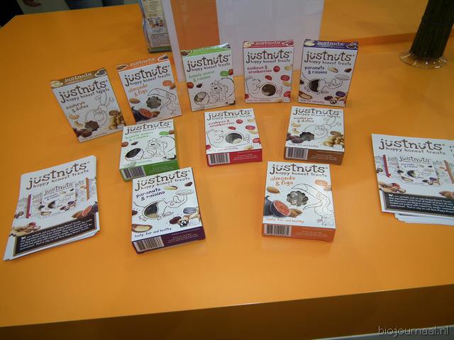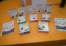 De complete lijn van justnuts, met daarbij de drie nieuwe smaken. Door de creatieve verpakking en verrassende smaken met recht een noviteit te noemen!