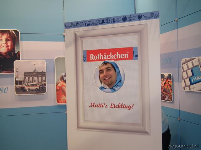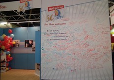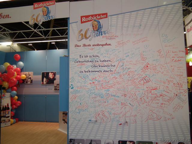 Rotbäckchen fruitsappen viert dit jaar haar zestigjarig bestaan. Op deze wand van de stand konden bezoekers een felicitatie voor het bedrijf optekenen.