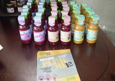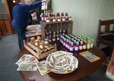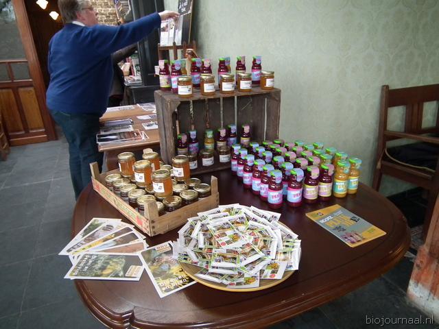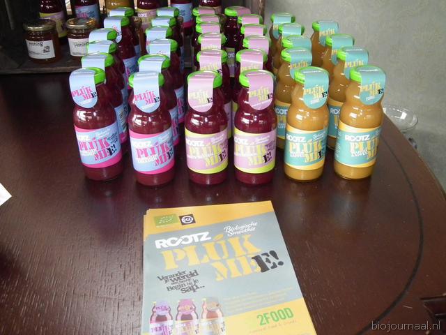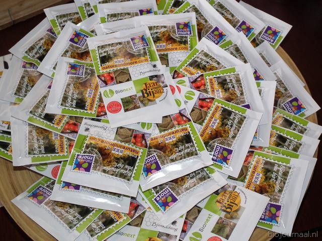De producten waar het om draaide: honing van imkerij De BIJzaak, de zakjes met bij-vriendelijke bloemenzaden (initiatief in het kader van het Jaar van de Bij, van de Bijenstichting, Bionext, De Bolster en Eosta) en rechts wat flesjes van Rootz.