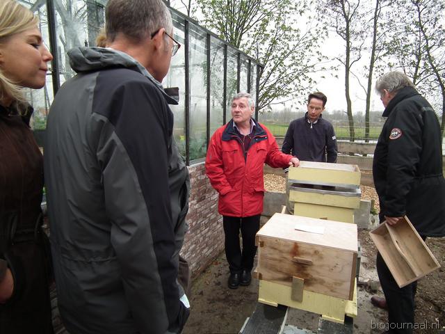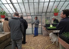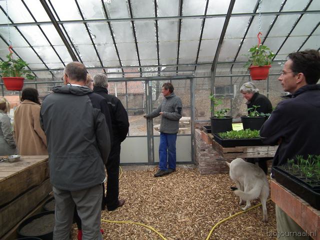 Tuinder Ton vertelt in de recent gebouwde groentekas over de verschillende zaden die daarin gekiemd worden.