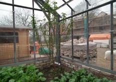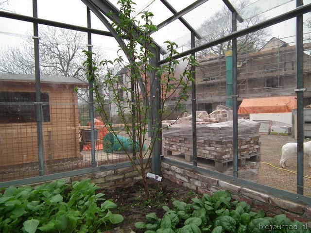 Dankzij een uitgezaagde cirkel kunnen de wortelen van deze fruitboom zich ook in de kas verder ontwikkelen. Op de foto de Red Gold-nectarine.