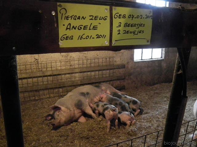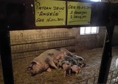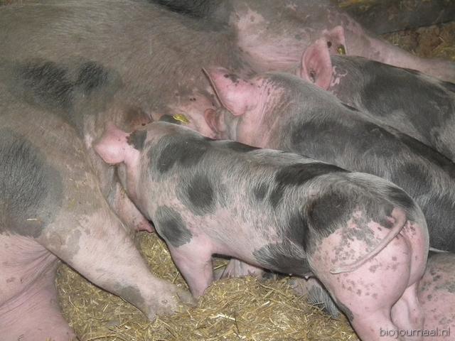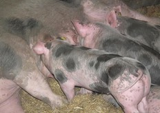 De bijna twee maanden oude biggetjes drinken bij moeder Angele.