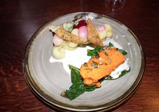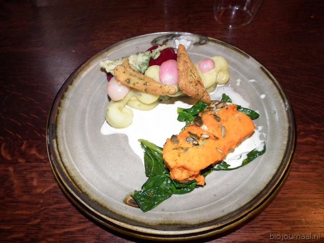 Het hoofdgerecht, met onder meer roergebakken spinazie, een wortelterrine en zachtgegaade radijs (van de Levende Buitenplaats). De room komt van een boerin in Schipluiden.