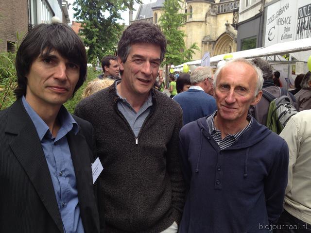 Voorzitter van BioForum Vlaanderen Kurt Sannen met de awardwinnaars Alexander Claeys van Het Hinkelspel (midden) en Rolle De Bruyne van Den Hogen Akker (rechts)