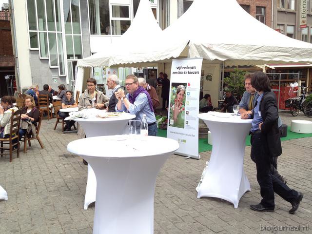 BioForum had gezorgd voor voldoende plaats om de gepresenteerde lekkernijen te nuttigen. Rechtsonder voorzitter Kurt Sannen in gesprek.