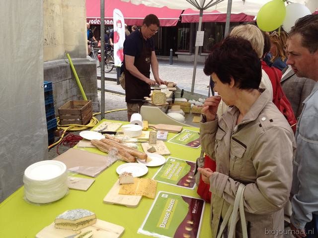 Paul Verbeke van BioForum snijdt bij zijn kraam op verzoek de kazen van Damse kazen, Capra en de winnaar van de smaakaward Het Hinkelspel.