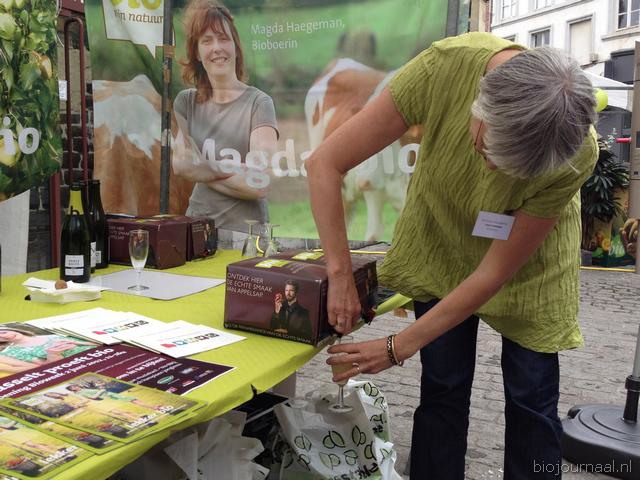 Leen Laenens schenkt appelsap uit de verpakking die speciaal voor de Bioweek is gemaakt (met daarop Pieter Embrects, het gezicht van de Bioweek)
