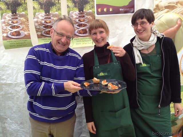 Jan-Bart van In (links) van La vie est belle zorgt goed voor zijn buurvrouwen van Bioshop Hasselt. La vie est belle is producent van 100% biologische vegetarische burgers en aperitiefhapjes.