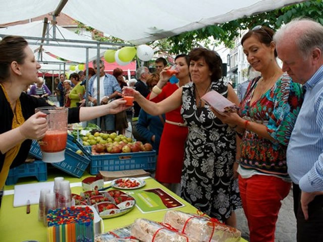 De burgemeester en de minister samen op smaaktour langs 'Hasselt proeft bio'. Foto: BioForum - Esmeralda Borgo