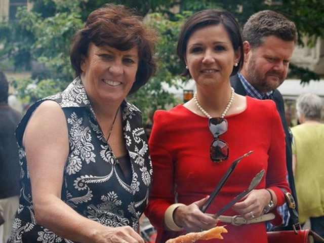 Bio-vlees op de bbq! Links viceminister-president Ingrid Lieten. Rechts van haar de burgemeester van Hasselt, Hilde Claes. Samen genoten zij als eerste van de bio-bbq. Foto: BioForum - Esmeralda Borgo